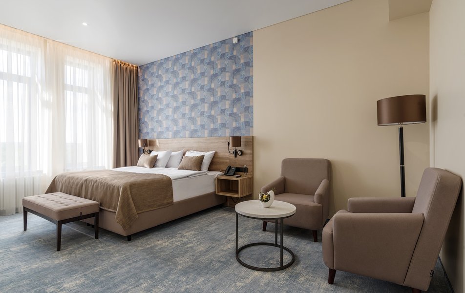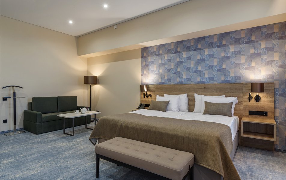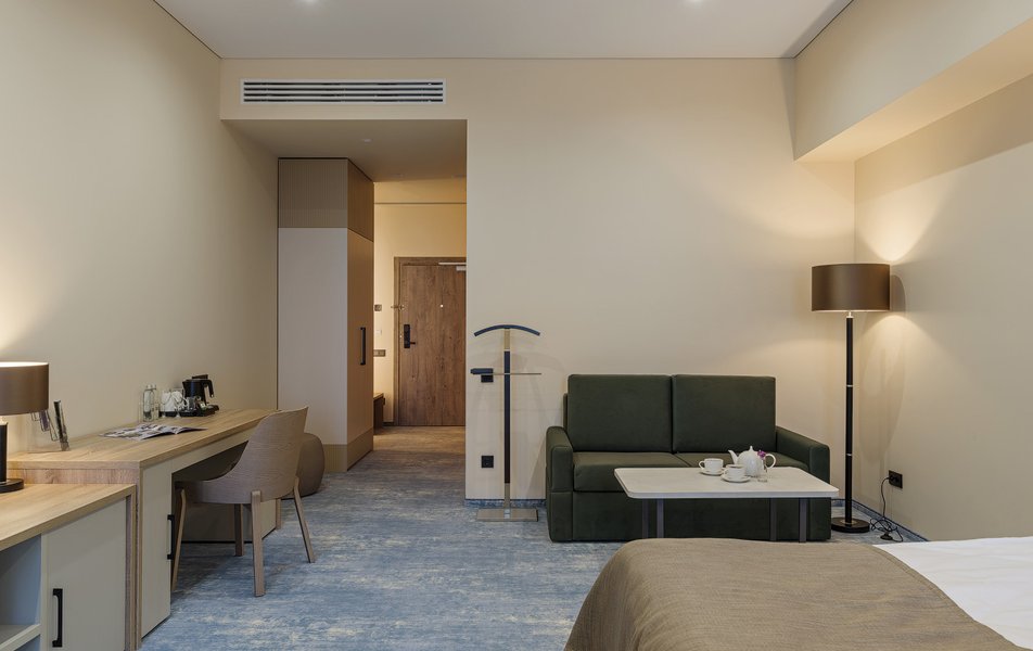 В номере: вешалка, диван, зеркало, кресло, кровать двуспальная, прикроватные тумбочки, стол, шкаф, мини-холодильник, сейф, телевизор ЖК, телефон, чайный набор посуды, электрочайник
