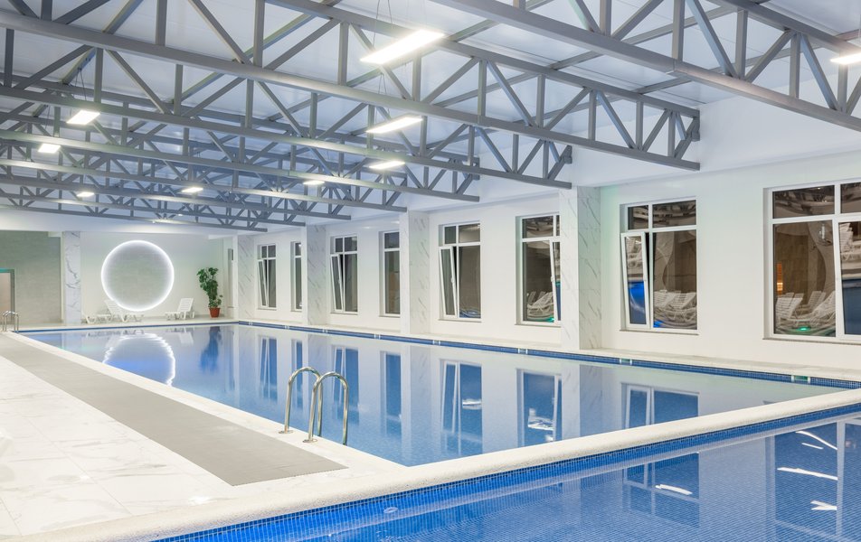 - Крытый малый бассейн – площадь 90 м², размеры 6 × 15 м, глубина 0,6 м, подходит для детей и взрослых. Рядом душ и шезлонги.