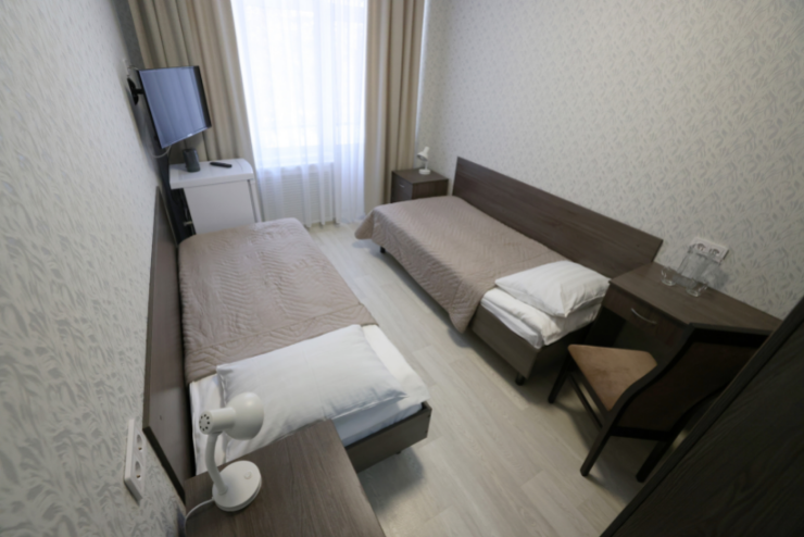 Оснащение номера: две односпальные кровати, прикроватные тумбы, стол, стулья, шкаф для одежды, телевизор, холодильник, электрочайник, бесплатный интернет Wi-Fi
